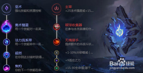 携带巫术系的奥术彗星加上法力流系带、超然和焦灼,副系则是本家儿宰系的眼球收集器和无情猎手,属性碎片选择冷却减缩,自顺应和生命值。这套符文能显著提高火男的危险。
