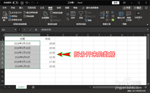 设置好之后,点击弹窗下方的“完当作”按钮返回到表格文档中,可以看到选中的单位格数据已经按我们的要求拆分到另一个单位格了。