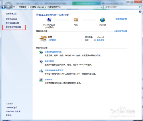 然后我们点击收集和共享中间界面左侧的更改高级共享设置选项,如图所示;