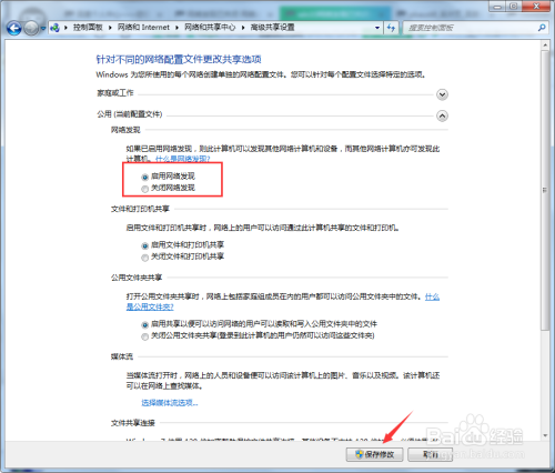 然后我们打开高级共享设置界面发现收集发现开关是封闭着的,如图所示;