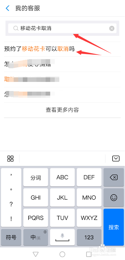 在我的客服搜刮界面里直接搜刮【移动花卡打消】,然后直接点击搜刮出来的【预约移动花卡可以打消吗】,如下图所示。