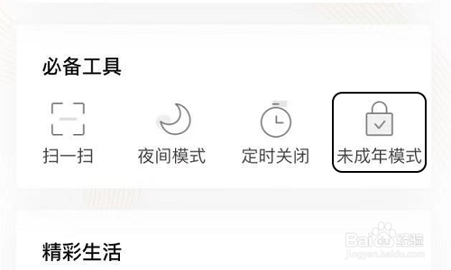 在对应的我的页面内,我们即可看到必备东西里的“未当作年模式”了,系统默认的一般为封闭状况;