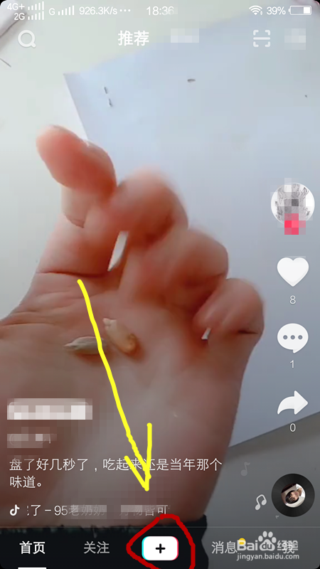 我们进入抖音短视频今后,会看到播放的视频,我们点击下方的加号,进入抖音短视频拍摄的界面里面去。