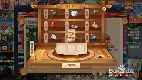 打开新春厨房页面,将提前收集好的9种材料看细心,拔取”珍贵药材“、”大米“、”肉“三种材料,放入期待烹调的三个格子中。