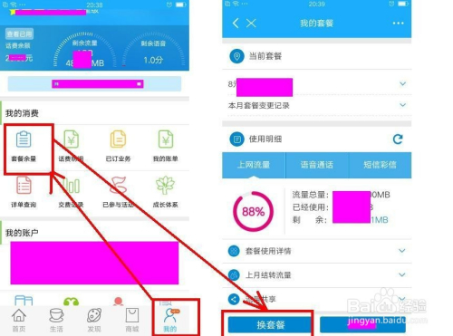 验证登录之后,点击“我”——在我的消费栏目那边选择:套餐余量——在套餐余量页面下方点击换套餐。