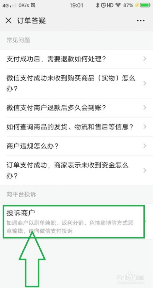 点击“对订单有迷惑”,进入到订单答疑页面,在页面上可以看到“投诉商户”。