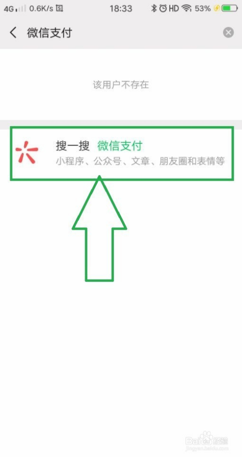 在搜刮栏中键入“微信付出”,然后进行搜刮,我们可以在搜刮成果中看到没有该用户,
