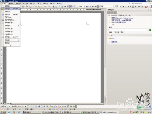 在打开的Worde2003中点击东西栏里的“文件”点击“打开”,如下图