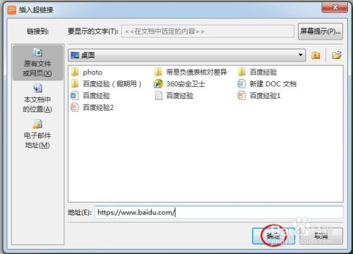 第五步:在超链接对话框地址栏输入要链接的地址,单击“确定”按钮。