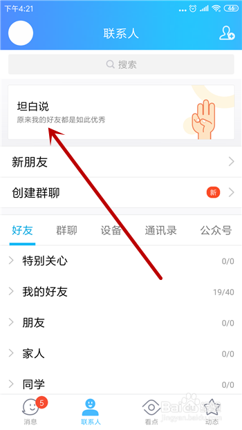 联系人界面的上方就能看到【率直说】,点击打开率直说。