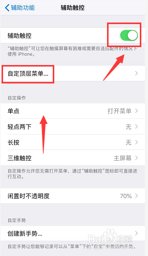 进入辅助触控界面,打开辅助触控的功能开关,再选中下方的“自定顶层菜单”。