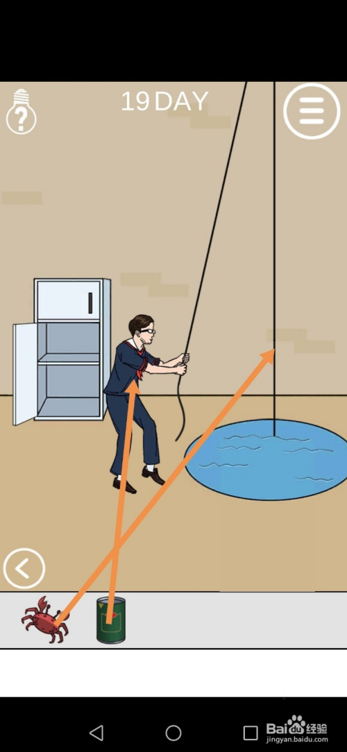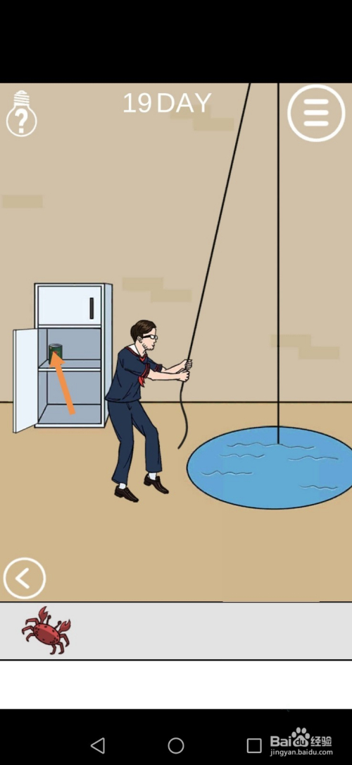 在左边房间里,将石头拖动到罐子上,接着点击螃蟹,然后点击标的目的右箭头进入右边的房间。