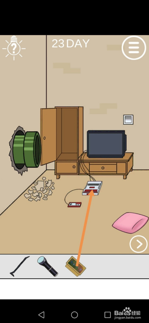 点击墙上的管道,然后将游戏卡带拖动到游戏机上就过关了。