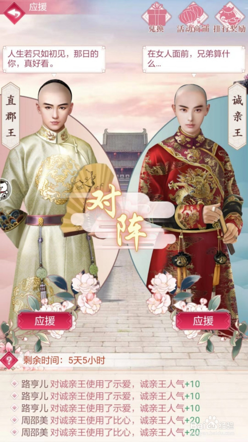 第一步:在游戏本家儿界面,选择左侧的“皇子应援”。
