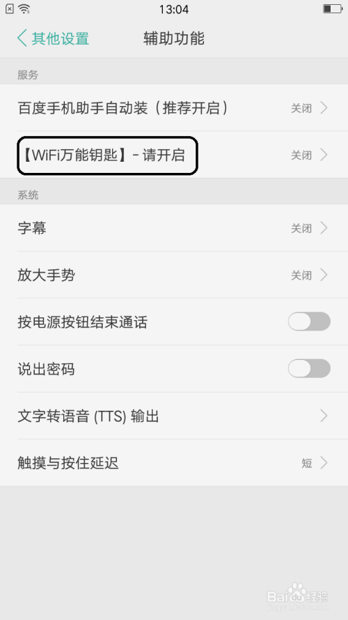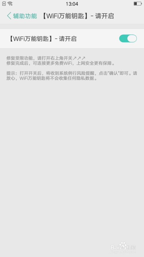 此时才能点击“利用”按钮后打开辅助功能界面中点击“wifi全能钥匙-请开启“选项。