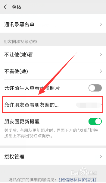 进入隐私的页面,你将会看到“许可伴侣查看朋友圈的规模”,如图所示