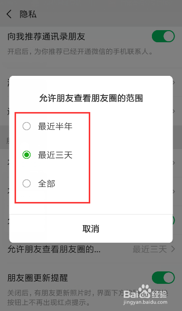 插手设置为三天,这时,在我的微信朋友圈,会看到只显示三天的,三天后的不会给别人看,如图所示