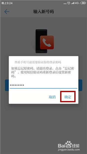 改换手机号之前需要输入本来的密码,输入后点击【确定】。