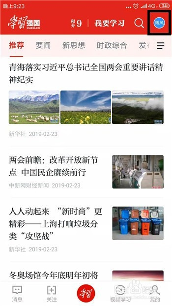 在学习强国APP的首页里点击右上角的头像,如图所示。