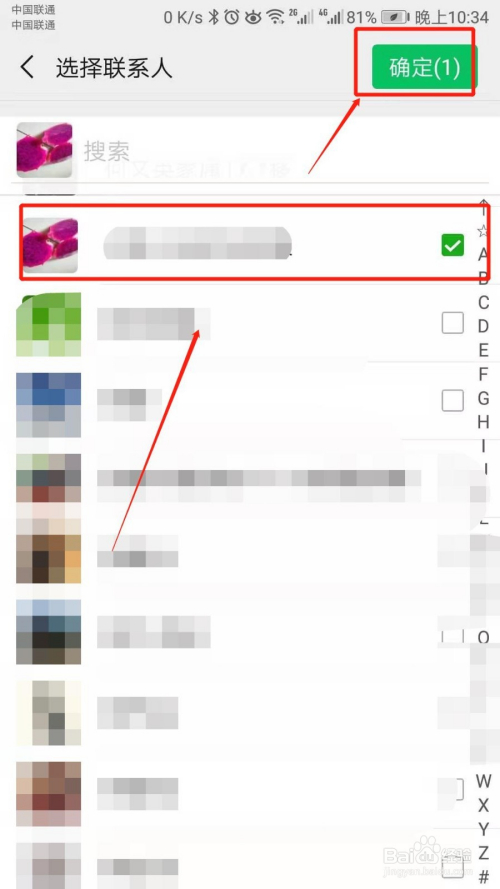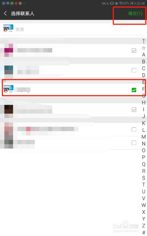 第五步,找到需要插手微信群的老友,并选中,然后点击右上角确定,如图所示。