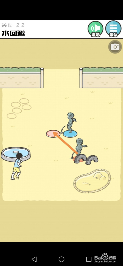 第22关先跑到出口将石像引到下图中箭头标注的位置。