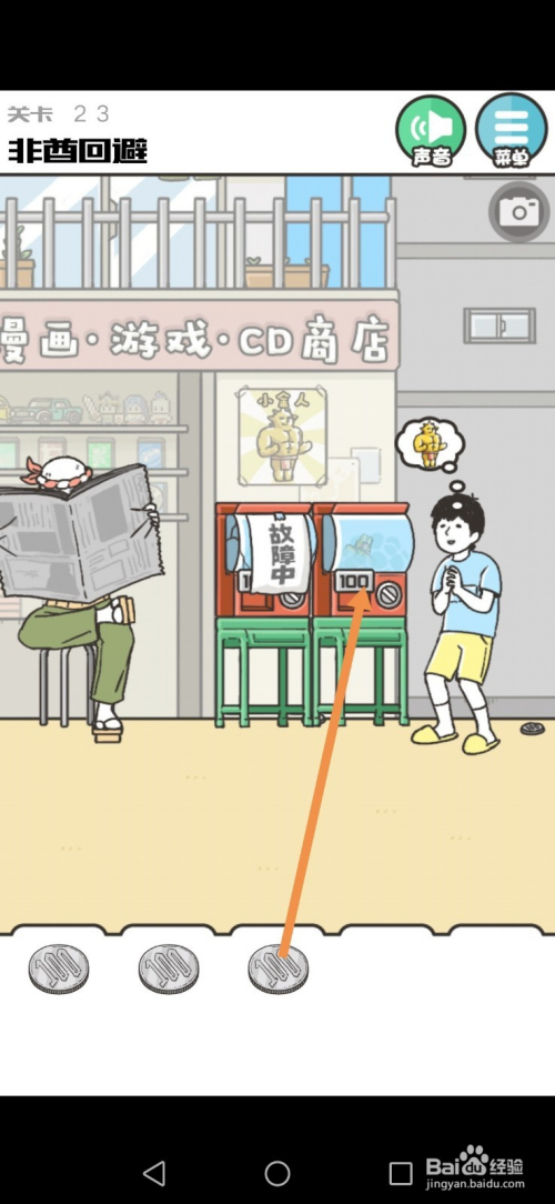 第23关在老板看报纸的时辰,点击扭蛋机三次。本家儿角的想要的玩具头朝下后,将硬币拖动到扭蛋机上就过关了。