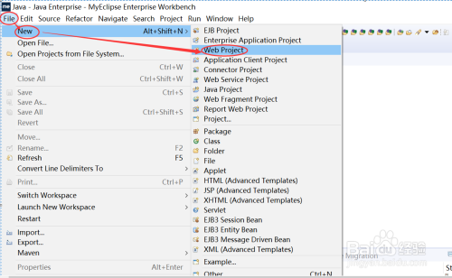 打开MyEclipse,点击“File”->“New”->“Web Project”,如下图所示: