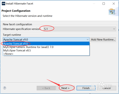 版本选择5.1,运行的办事器情况选择Apache Tomcat V9.0,然后点击“Next”,如下图所示: