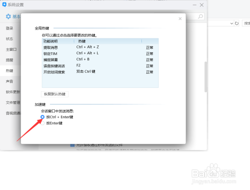 最后呢,我们设置加快键,按下Ctrl+enter键发送信息,有的小伙伴不喜好这个设置,也可以设置按下enter键发送信息,如下图所示。