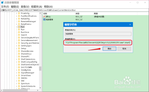 左键双击注册表编纂器窗口中的 电脑管家,在弹出的 编纂字符串 对话框中,将电脑管家的数值数据粘贴到 数值数据(V)栏中,再点击:确定;