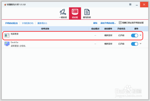 进入软媒优化巨匠 - 启动项,可以看到已添加了【电脑管家】开机启动项。