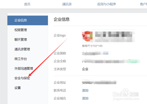 进入我的企业界面后,直接点击左侧导航里的【平安与保密】,如下图所示。