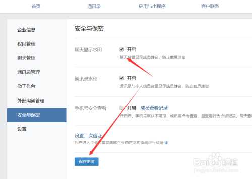 点击平安与保密后,在右侧就可以看到聊天显示水印选项,直接勾选后在点击下面的【保留设置】,如下图所示。