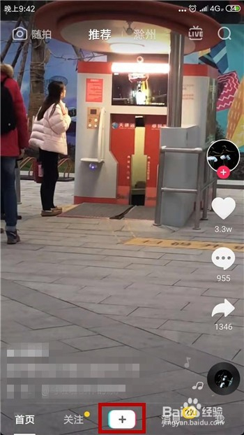 借助抖音道具即可拍出素描结果,在抖音首页点击底部的【+】。