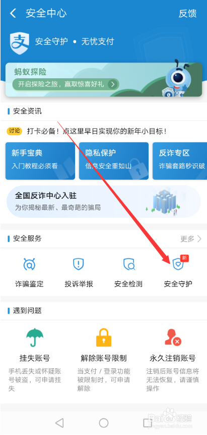 进入到付出宝平安中间后,在这里就可以看到付出宝平安守护选项了,如下图所示。