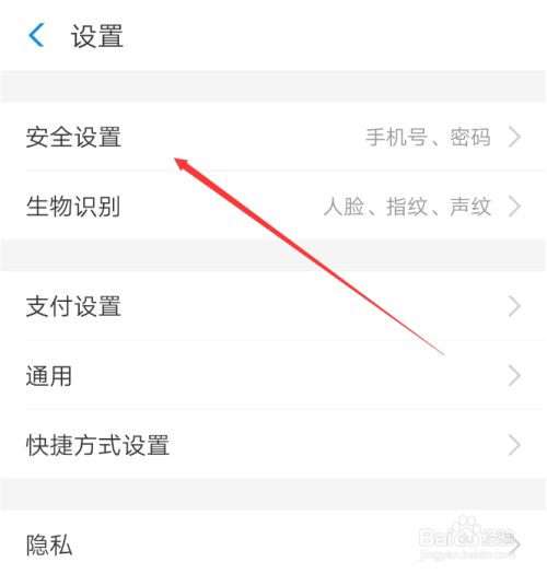 进入付出宝设置界面后,在最上面就是【平安设置】选项,如下图所示。