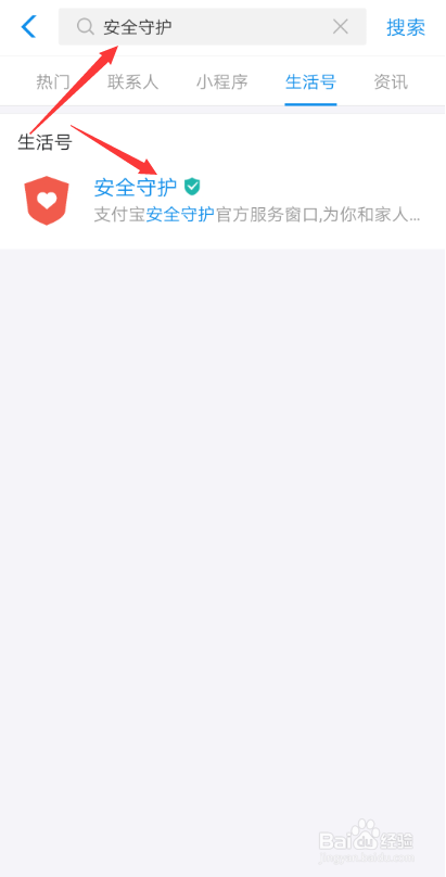直接打开付出宝搜索框,然后搜刮平安守护,然后点击搜刮到付出宝平安守护的糊口号,如下图所示。