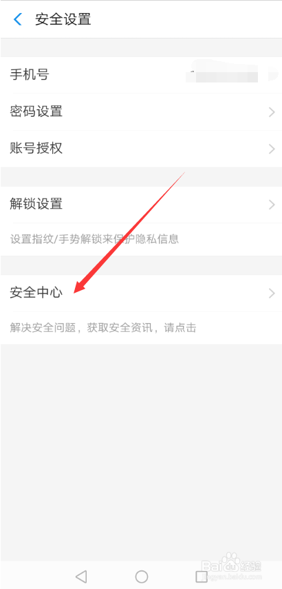进入付出宝平安设置界面后直接点击底部的【平安中间】,如下图所示。