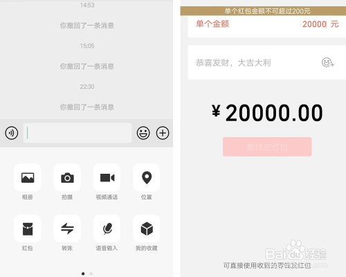 面临面收红包时,除了可以发通俗红包,还可以设置拼手气红包,每次不克不及跨越20000元