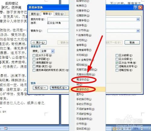 选定“脚注标识表记标帜”或者“从头至尾注标识表记标帜“”