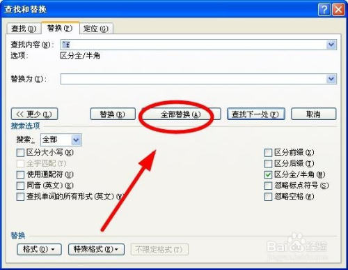 不必在“替代为”后面输入任何内容,然后单击“全数替 换”按钮即可