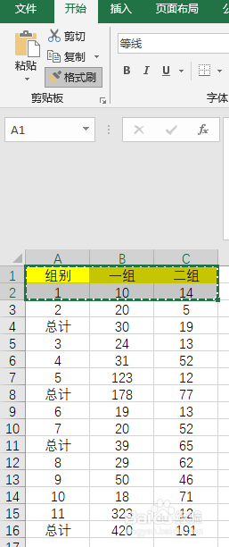 首行填充响应的颜色(如黄色),第二行不填充连结原样,同时选中首行和第二行,单击格局刷东西,利用快捷键ctrl+A,快速填充
