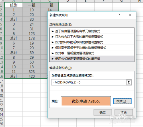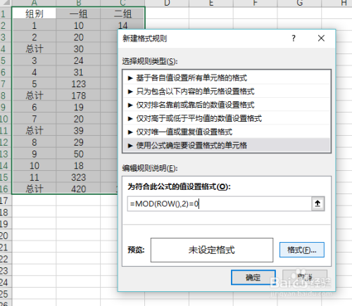 单击利用公式确定要设置格局的单位格,输入“=MOD(ROW(),2)=0”,然后再单击右下角格局按钮-选择填充-选择填充的颜色-确定