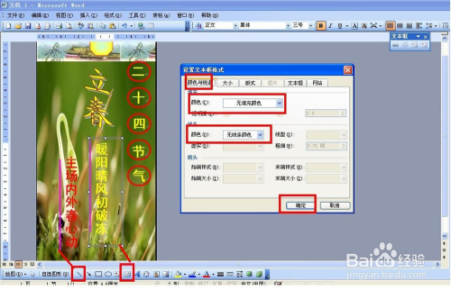 最后 ,在书签那边画两条直线,设置好颜色和粗线——再插入竖排文本框——为立春写上一些诗句并设置好字体大小和颜色。同样也要设置文本框为无填充颜色。