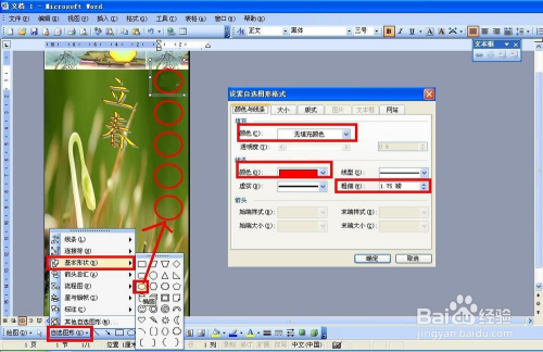 接着同样在根基外形那边选择圆形——在书签在右边从上到下画五个圆形——双击圆形——颜色和线条——颜色填充为无填充颜色、线条为红色、粗细为1.75磅——点击确定。