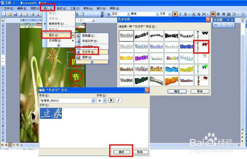 插入艺术字:点击插入——图片——艺术字——选择一种艺术字样式——输入:立春,然后设置字体——点击确定。若是字体颜色不对劲可以在菜单东西栏那边从头设置颜色。
