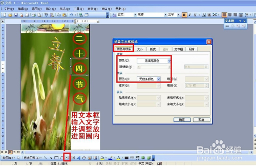 再接下来,选择文本框——双击文本框——设置颜色填充和线条颜色都设置为无填充颜色——在文本框输入文字“二”,设置好大小和颜色——复制方才写好文字的文本框,粘贴几回,把文字别离改当作十四骨气这几个字——把文字调整好放进圆圈内。