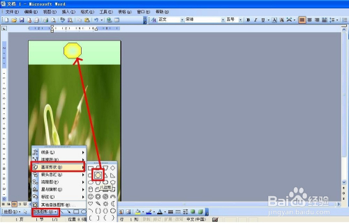 建造书签孔的位置:点击自选图形——根基外形——八边形,在页面的上端画一个八形——然后双击设置好填充颜色。