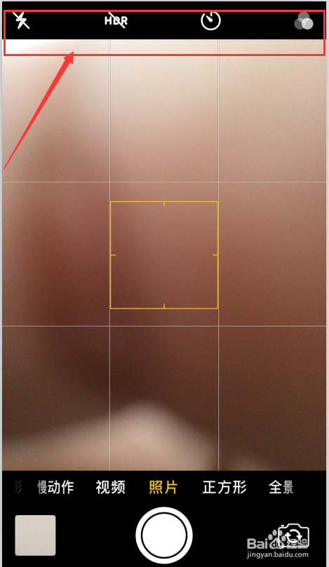 如图在照片功能上方,4个图标功能依次是,闪光、HDR(简单讲就是拍出来照片亮度比力平均比力亮)、延迟摄影和变色功能。