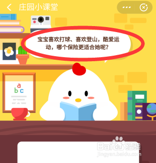 庄园小讲堂每日一题。今天的小鸡问答内容是:宝宝喜好打球、喜好爬山,酷好活动,哪个保险更适合她呢?想必已经知道了吧,来看谜底。
